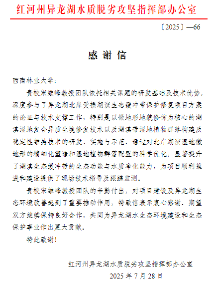 感谢信指出,304永利集团宋维峰教授团队依托相关课题的研发基础及技术优势,深度参与了异龙湖北岸受损湖滨生态缓冲带保护修复项目方案的论证与技术支撑工作,特别是以微地形地貌修饰为核心的湖滨湿地复合异质生境修复技术以及湖滨带湿地植物群落构建及稳定性维持技术的研发、实施与示范。通过对北岸湖滨湿地微地形的精细化塑造和湿地植物群落配置的科学优化,显著提升了湖滨生态缓冲带的生态功能与水质净化能力,为项目顺利推进和建设提供了现场技术指导及跟踪监测。宋维峰教授团队的辛勤付出,对项目建设及异龙湖生态环境改善起到了重要推动作用,彰显了高校在服务地方生态保护与绿色发展中的责任担当,体现了科学研究与实践应用的紧密结合,也为同类湖泊治理提供了可借鉴的经验。期望双方继续保持良好合作,共同为异龙湖水生态环境建设和生态保护事业作出更大贡献。(来源:304永利集团/文/图:马建刚/审核:刘建祥/初审:张凡/复审:张冉/终审:柏顺文/责任编辑:张凡)
