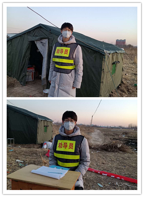 生态与环境公司农业资源与环境2018级的王天祺同学是一名入党积极分子,得知疫情的第一时间,他积极报名参加了家乡的志愿活动。他和其他志愿者24小时轮流值班,驻守在当地设置的进出口卡点上,对每一位进出的人员登记,包括进出时间电话姓名目的地等等信息,累了就在临时搭建的帐篷里休息,确保24小时都有人在点上值班。他说参加本次志愿活动,懂得了疫情无情,人间有情。在卡点值守过程中,虽然很冷,但人心是暖的。他在这次志愿活动中学到了很多,立志做一名有担当的人。