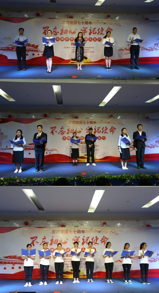 本次比赛,由慷慨激昂的《有一首歌》拉开了比赛的序幕,该作品生动讲述了没有共产党就没有新中国这一首歌创作背景,表达了对中国共产党的热爱和对祖国美好未来的憧憬,选手声情并茂的演绎引发观众强烈的共鸣。《我爱你中国》描述了祖国大地美好风光,表达了对祖国的赞美和热爱。《沁园春·雪》的表演者情绪饱满,深情地讲述了作品创作背景,并激情彭拜进行了朗诵。《祖国颂》表达了广大青年人对祖国的热爱,号召青年为新时代的建设添砖加瓦。《初心不染》再次表达了共产党人的初心,为中国人民谋幸福,为中华民族谋复兴。一首《我的南方和北方》深切表达了南方或者北方,无论我们身处何方,眷恋的都是脚下的这片土地。《未来,我来》讲述了中国共产党带领中华儿女,实现了从站起来、富起来到强起来的历史性飞跃,并作出承诺未来一定是由我们改写。《七子之歌》深情演绎眷怀祖国之哀忱,亦以励国人之奋兴云尔。《壮丽70年 奋斗新时代》讲述了值此新中国成立70周年,要为鲜艳的党旗再添风采、再谱新的篇章。《我骄傲我是中国人》表达了作为中国人无比骄傲,我们有悠久的历史,有灿烂的文化。这份骄傲和自豪已经深深植根于每个中国人的心中。《我爱我的祖国》祝祖国永远朝气蓬勃,复兴路上,大步向前,奋起扬帆。《祖国的明天更美好》表达了我们沐浴着新世纪的和风,为祖国祝福,祝福祖国的明天更美好。最后,本次朗诵大赛在激情澎湃的《青春中国》中缓缓谢幕。本次大赛表演精彩纷呈,选手们紧紧围绕主题,或激昂高亢,或低沉颂吟,或深情饱满,或娓娓道来,在音调缓急之间,怀着对祖国的热爱和深情,表达了强烈爱国情感和对祖国美好未来的无限憧憬。