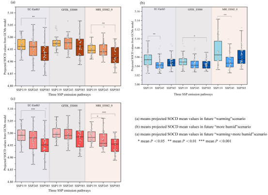 本研究整合了2000-2020年间2883个野外实测土壤剖面样点,结合气候、地形、土壤理化特征、植被及人类活动等多维驱动因子,利用集成机器学习算法(随机森林模型),实现了西南地区1公里空间分辨率的SOCD高精度制图,并在此基础上揭示了SOCD的历史演变、主控因素及未来变化趋势。研究进一步引入CMIP6情景下的气候与二氧化碳浓度预测数据,对2021-2060年不同社会经济路径(SSP1-1.9、SSP2-4.5、SSP5-8.5)下的碳库变化进行了情景模拟。研究发现:(1)在历史时期(2000s vs. 2010s),中国西南地区的平均SOCD呈现出从C·m-2下降至5.29 kgC·m-2的轻微下降趋势。这种变化在空间上分布不均,约有25%的区域(尤其在云南、重庆和广西部分地区)经历了显著的碳流失。(2)驱动历史SOCD损失的主要因素是环境变化(贡献率-3.48%)和气候变化(贡献率-0.84%)。相比之下,植被绿度的增加对SOCD起到了积极的促进作用(贡献率+0.41%),但在很大程度上被前两者的负面影响所抵消。(3)对未来的预测显示,在所有排放情景下,持续升温将导致SOCD持续流失。虽然降水增加和二氧化碳施肥效应可能会带来一定的碳增汇,但在“升温和增湿”共同作用下,净效应仍然是碳流失。这凸显了控制升温对于保护土壤碳库的紧迫性。