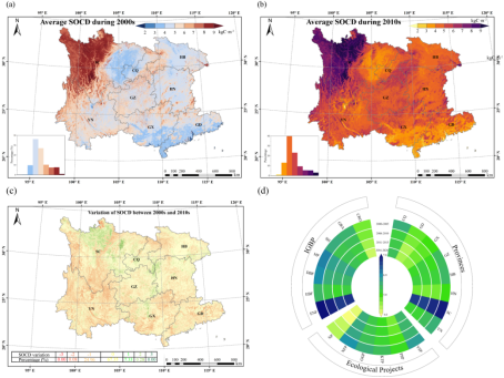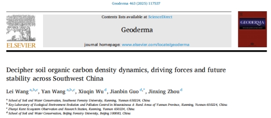 土壤有机碳(SOC)是陆地生态系统中最大且最具活性的碳库之一,对全球碳循环与气候调节具有关键作用。西南地区作为重要的生态屏障和碳汇功能区,同时也是生态脆弱区,实施了多项大规模生态恢复工程。但该区域地形复杂、生境破碎,加之现有SOCD数据集多为2014年之前的数据,缺乏近期的观测资料,导致对该区域SOCD动态及其驱动机制的理解仍然有限。精准评估该区域SOCD的动态特征及其驱动机制,对于理解碳循环过程、制定区域减排与碳中和战略具有重要科学与实践意义。